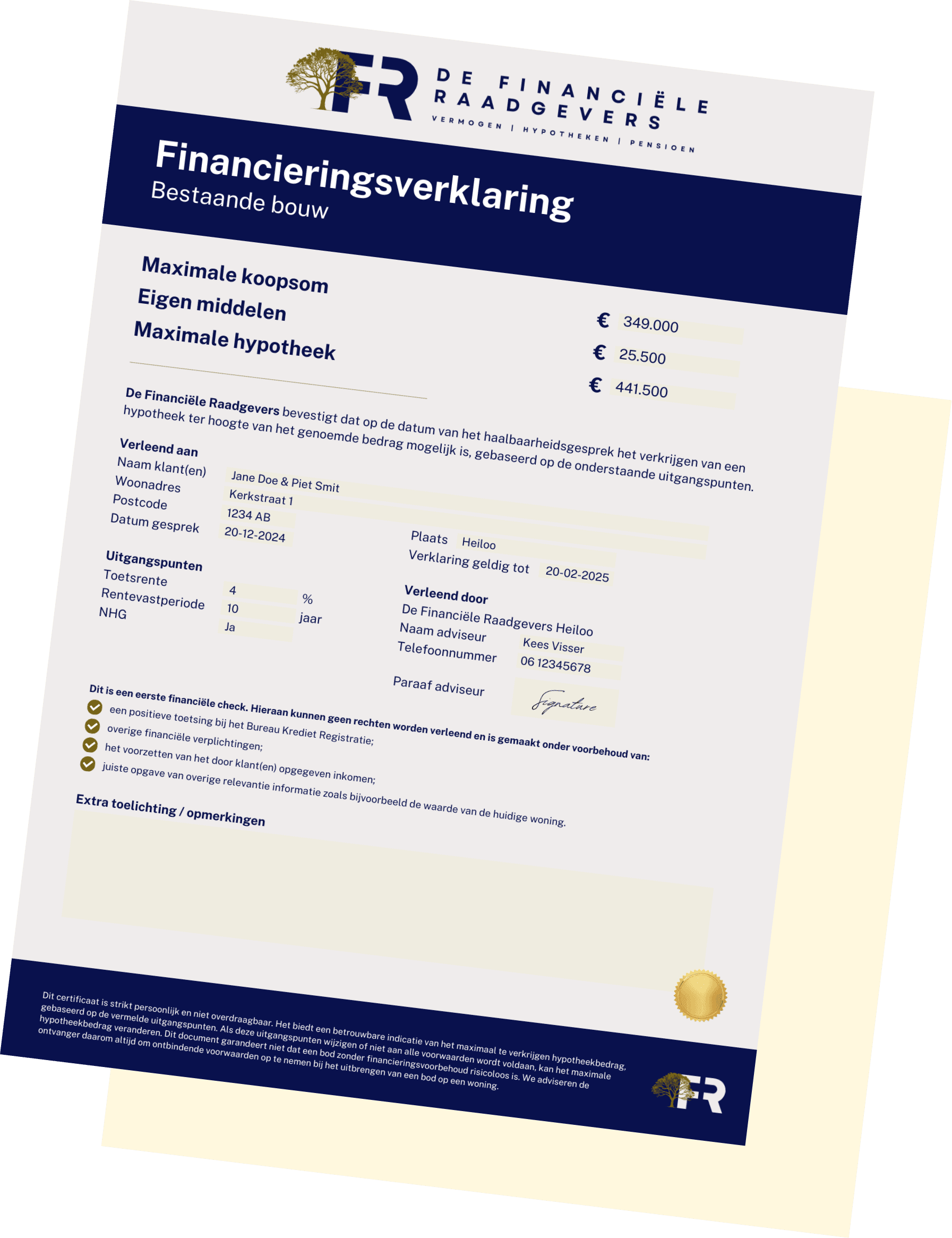 Bij De Financiële Raadgevers is een oriëntatiegesprek en het opstellen van een financieringsverklaring kosteloos en vrijblijvend. Bij ons kun je altijd een gratis financieringsverklaring aanvragen.
